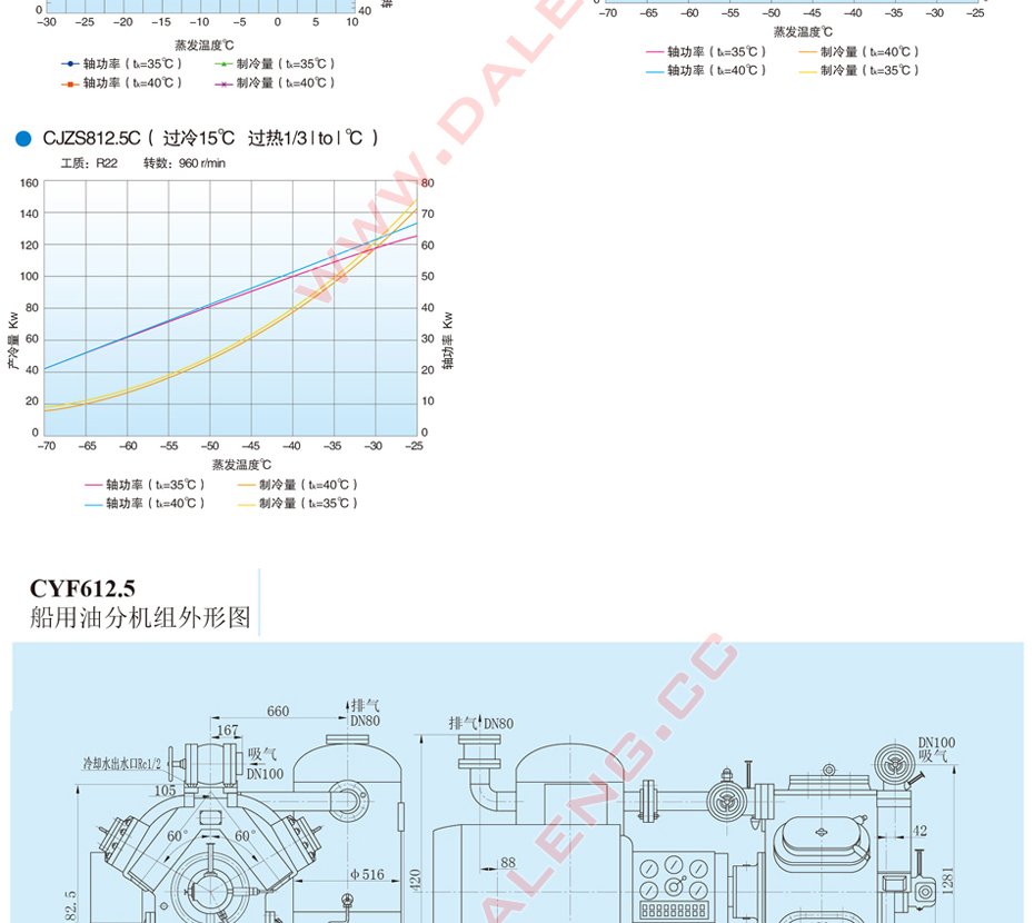 船用活塞式制冷压缩机组中的压缩机有单级、单机双级两种机型,均属高速、多缸、逆流式压缩机,设有能量调节装置,可实现无负荷启动,压缩机还设有装放油阀,可在运转中加油。压缩机组由压缩机、电动机、控制台等组成,其中,单机双级机型还设有中间冷却器。所有机组均设有高效油分离器和自动回油装置。这些部件均安装在同一公共机座上。控制台上装有高、中压、油压继电器,保护机器运行安全可靠。船用机组均经摇摆台试验,可确保在航行中的可靠运行。