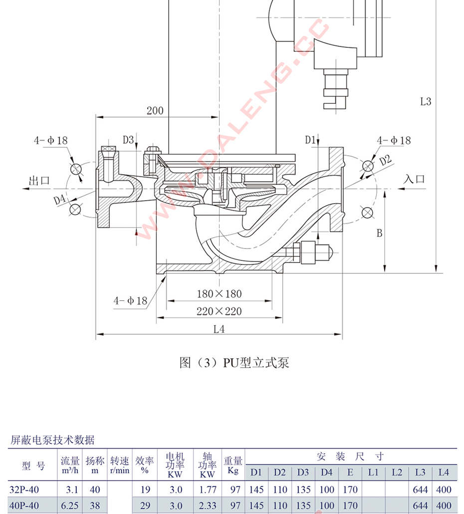 其中PU型、PW型系列屏蔽电泵的主要特征是在泵的进口处叶轮前端设有自吸能力装置。在氨氟制冷系统中,可以在-50℃的低温工况下保持正常的供液状态。并且因具有自吸能力,从而降低了对液体的液位高度设计要求,进一步降低了设备的安装高度。