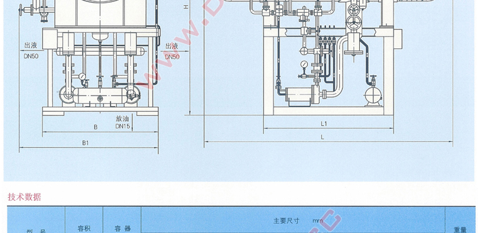 本系列组合装置将卧式低压循环贮液桶和两台离心式屏蔽电泵组装在同一钢架上,工艺管路,阀门、自控元件、电气元件均已装配齐全,构成桶泵一体化供液装置。本系列组合装置具有自动供液、液位显示、液位高度报警、氨泵自动或手动操作等功能。