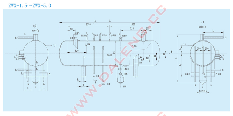 船用卧式低压循环贮液桶,装在氟泵供液制冷系统中,其功能是保证充分向蒸发器供应低压氟液,同时也起到了氟液分离器的作用,保证压缩机吸入的制冷剂是气态,避免压缩机吸气带液造成压缩机损坏。