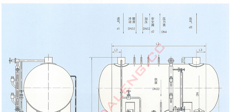 本系列组合装置将卧式低压循环贮液桶和两台离心式屏蔽电泵组装在同一钢架上,工艺管路,阀门、自控元件、电气元件均已装配齐全,构成桶泵一体化供液装置。本系列组合装置具有自动供液、液位显示、液位高度报警、氨泵自动或手动操作等功能。
