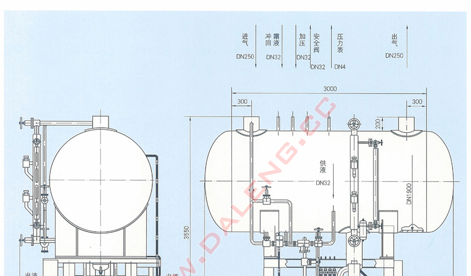 本系列组合装置将卧式低压循环贮液桶和两台离心式屏蔽电泵组装在同一钢架上,工艺管路,阀门、自控元件、电气元件均已装配齐全,构成桶泵一体化供液装置。本系列组合装置具有自动供液、液位显示、液位高度报警、氨泵自动或手动操作等功能。